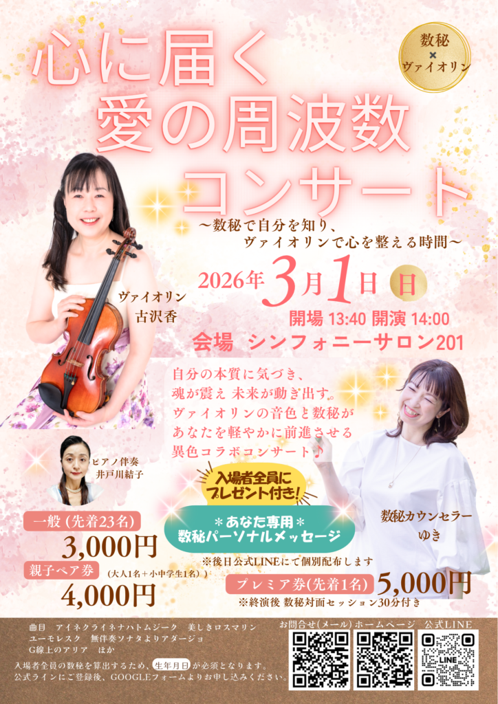 3/1 数秘✖️ヴァイオリン 心に届く愛の周波数コンサート開催決定!