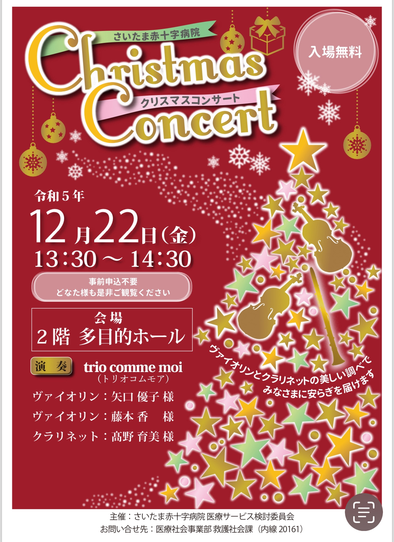 12/22 さいたま赤十字病院 クリスマスコンサート 2025 2/01 日時 2023年12月22日(金) 13:00~ 会場 さいたま赤十字病院 出演 バイオリン 矢口優子 古沢香 クラリネット 高野育美 曲目 ジッパディドゥーダ きよしこの夜 いい日旅立ち 赤いスイートピー ジングルベル ホワイトクリスマス ほか 介護施設訪問演奏