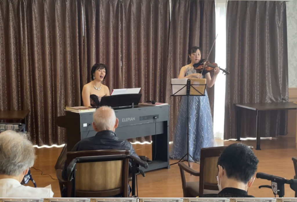 日時 2023年6月4日(日) 14:00~ 会場 埼玉県内介護施設 まどか秋津 出演 ピアノ 尾高弘美 バイオリン 古沢香 曲目 愛のあいさつ タイスの瞑想曲 瀬戸の花嫁 セレナーデ ブラームスの子守歌 ほか