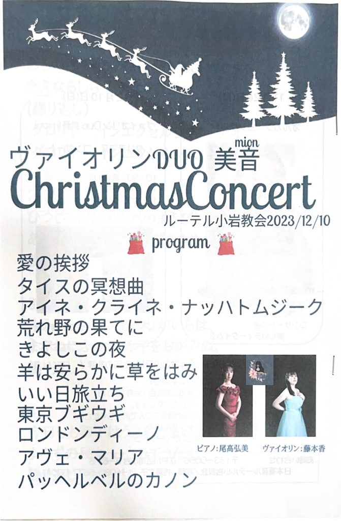 日時 2023年12月10日(日) 12:00~ 会場 ルーテル小岩教会 出演 ピアノ 尾高弘美 バイオリン 古沢香 曲目 愛のあいさつ タイスの瞑想曲 羊は安らかに草をはみ ロンドンディーノ ほか -
